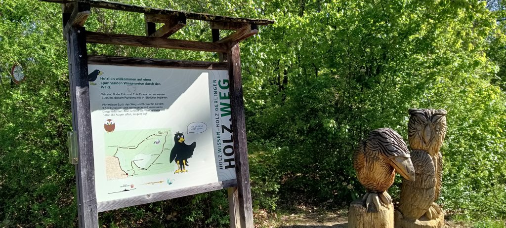 Hier habt ihr sogar an Feiertagen eure Ruhe 😉 Wir waren fast alleine auf dem tollen Holzweg in Holzgerlingen unterwegs. Parken könnt ihr direkt am Beginn des Weges. Dort begrüßen auch schon Rabe Fritz und Eule Emma und nehmen euch auf einen 3.5 km langen Rundweg mit 14 Stationen mit. Der Weg ist barrierefrei und gut mit Kinderwagen oder Fuxtec zu laufen.